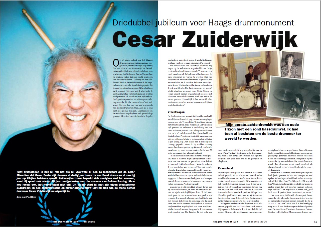 De zo typische lach van Cesar galmt over de prachtig aangelegde tuin. Het mooie vakantiepark, aangedrukt tegen de grensplaats Baarle-Nassau, iets ten zuiden van Breda, is het vakantiestekje van Cesar en zijn Hester. Ruim twintig jaar terug kwam ik er voor het eerst. De Slagwerkkrant, Cesars lijfblad, wilde een mooi interview met de markante drummer van de Golden Earring en tot mijn verbazing kreeg ik een adres door dat hemelsbreed maar vijftig kilometer van mijn huis lag.